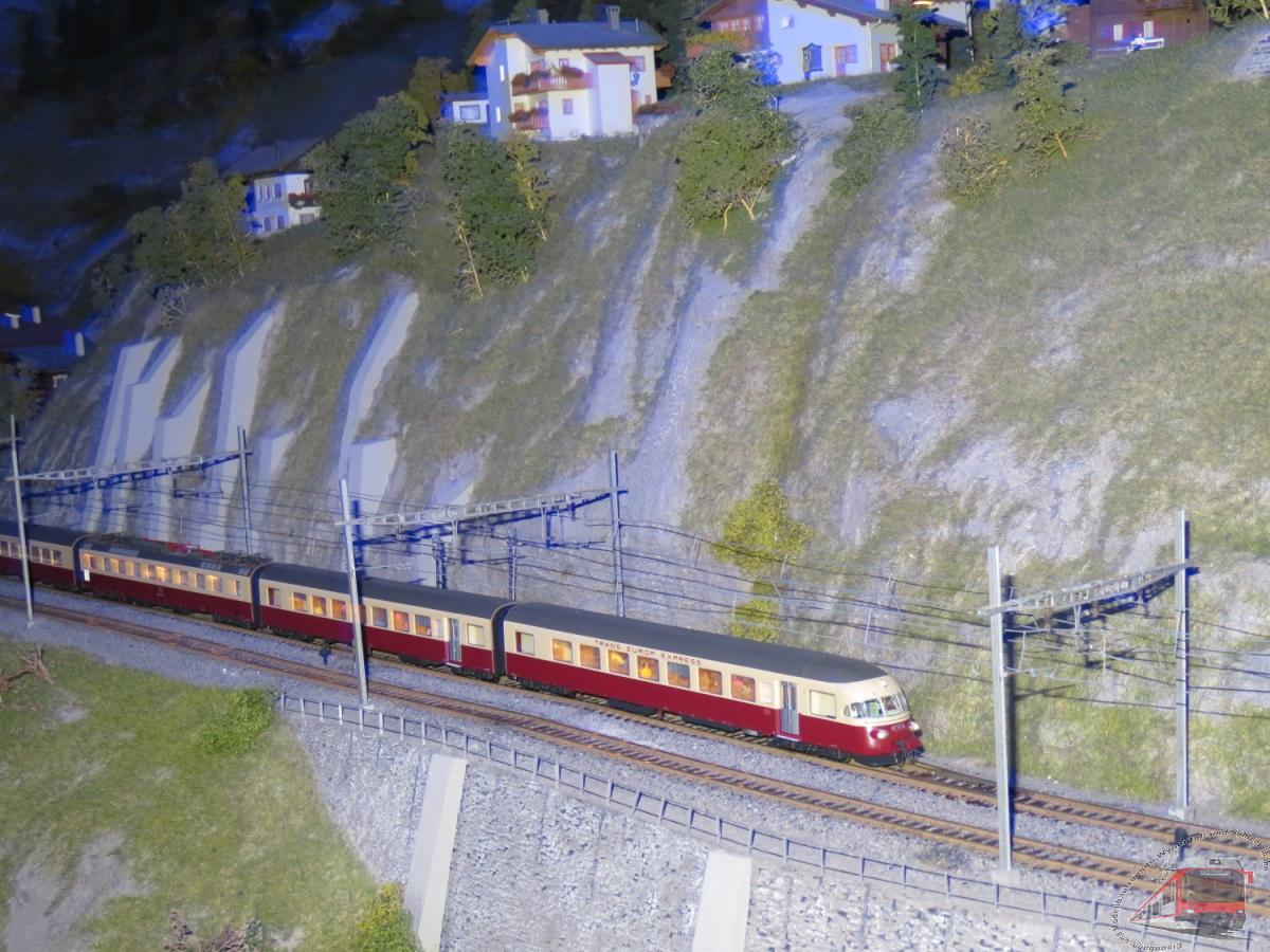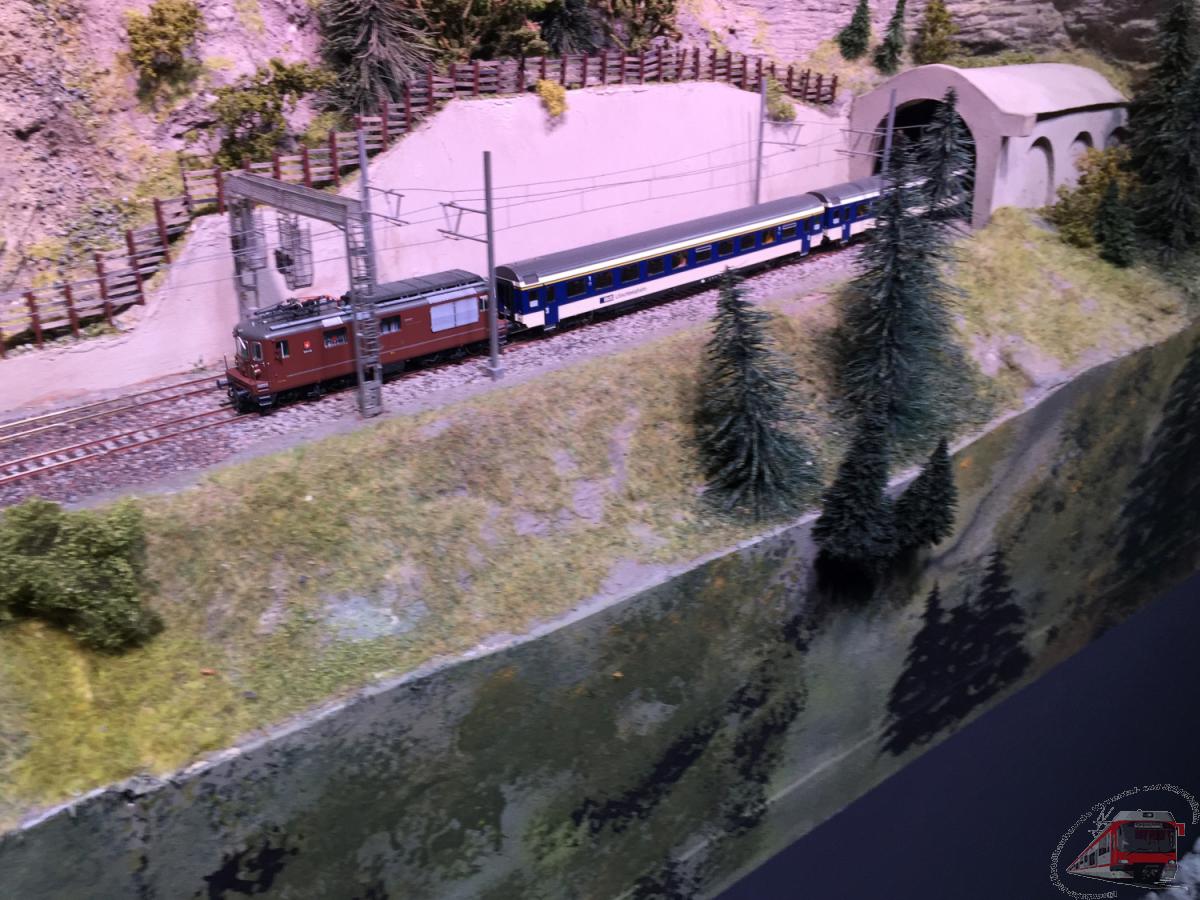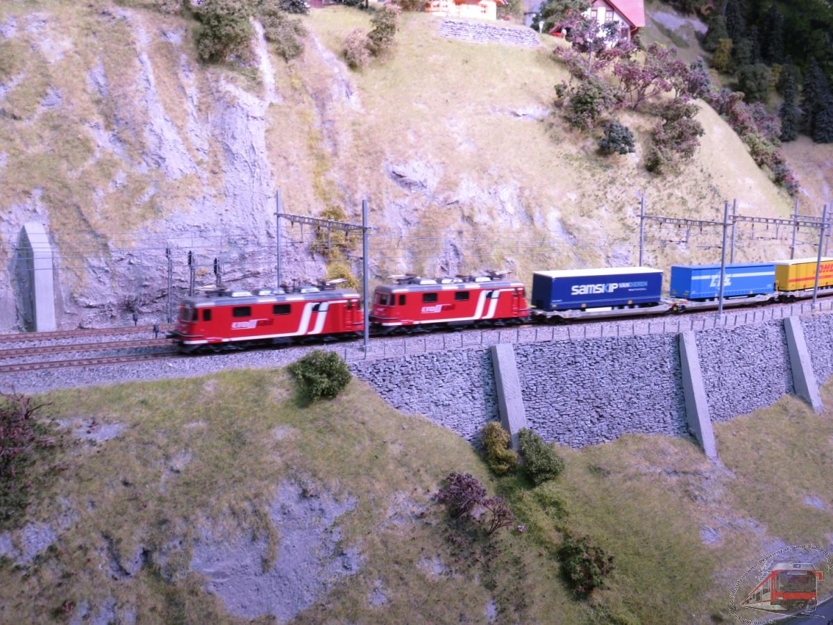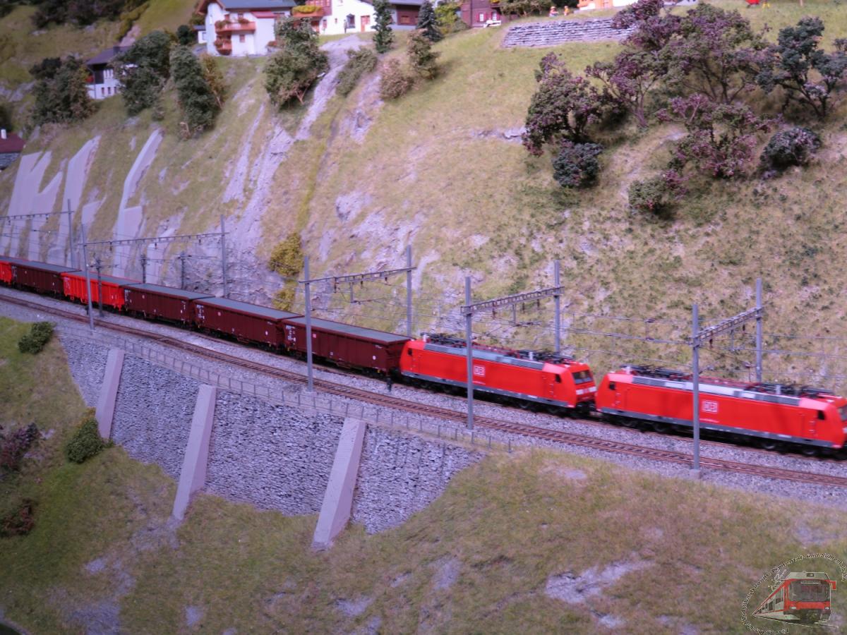 Landschaft und der modellmässige Bahnbetrieb.